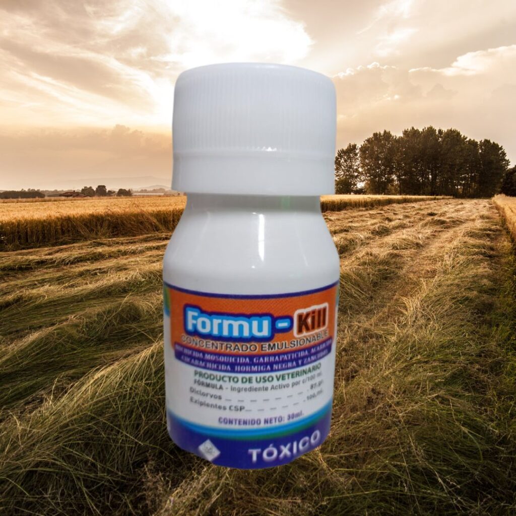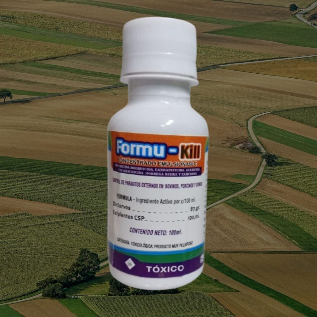 Formu-Kill 100 ml es un tratamiento antiparasitario externo concentrado para uso veterinario. Formulado con Diclorvos (87.9 g/100 ml), es eficaz contra una amplia gama de parásitos como moscas, garrapatas, ácaros, cucarachas, hormigas negras y zancudos. Su formato de 100 ml es ideal para ganaderos con grupos medianos de animales o para mantener en el botiquín rural.