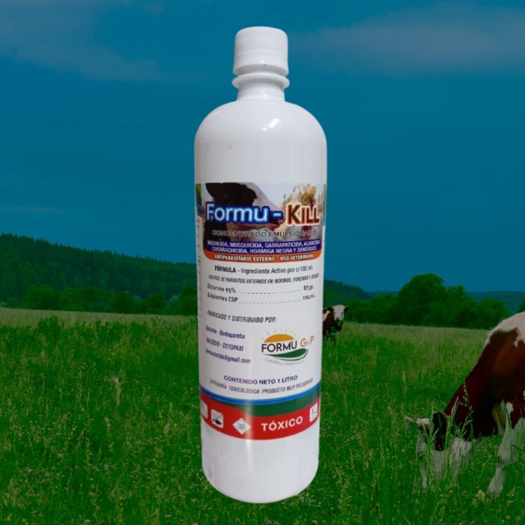 Formu-Kill 1 Litro es una solución profesional para el control de parásitos externos en explotaciones ganaderas a gran escala. Con una alta concentración de Diclorvos (95 g/100 ml), elimina eficazmente moscas, garrapatas, ácaros, cucarachas, piojos, hormigas negras y zancudos, protegiendo la salud de los animales y mejorando las condiciones sanitarias del entorno.